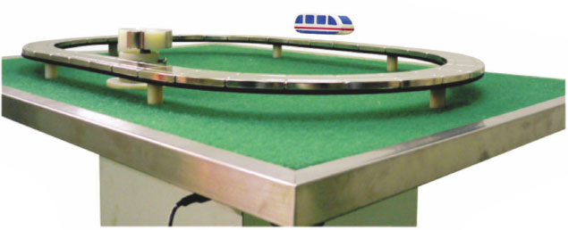 本演示裝置由環(huán)形軌道、底盤、超導小車及磁感應輔助驅動系統(tǒng)等組成,其中軌道由鐵環(huán)和吸附其上的 NdFeB 永久磁鐵材料構成,超導小車由小車模型、低溫杜瓦容器和高性能單疇釔鋇銅氧超導塊材構成。